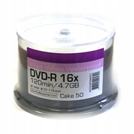 100 sztuk profesjonalnych nośników DVD-R o pojemności 4,7GB i prędkości zapisu 16x. Dyski te posiadają białą, wodoodporną, błyszczącą powierzchnię, fotograficznej jakości, bez logo producenta. Przeznaczone są do zadruku w drukarkach atramentowych i termicznych.